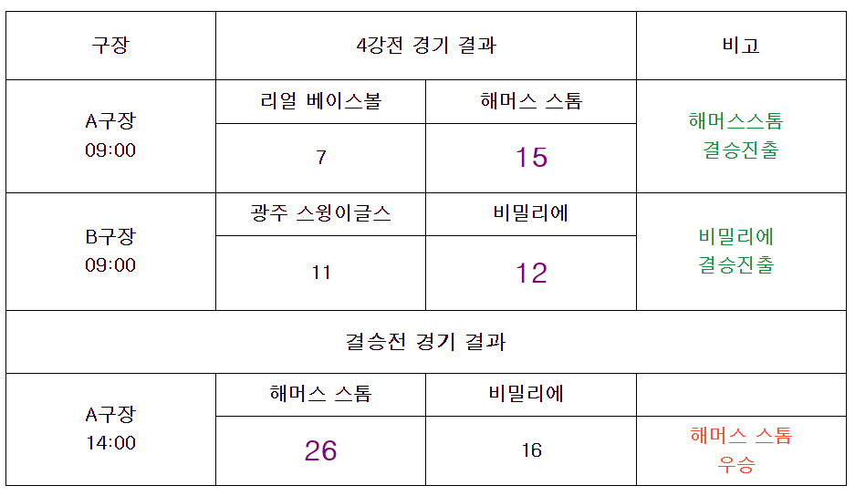 *단체상*우승 : 인천 해머스 스톰준우승 : 서울 비밀리에공동3위 : 광주 스윙이글스 서울 리얼베이스볼