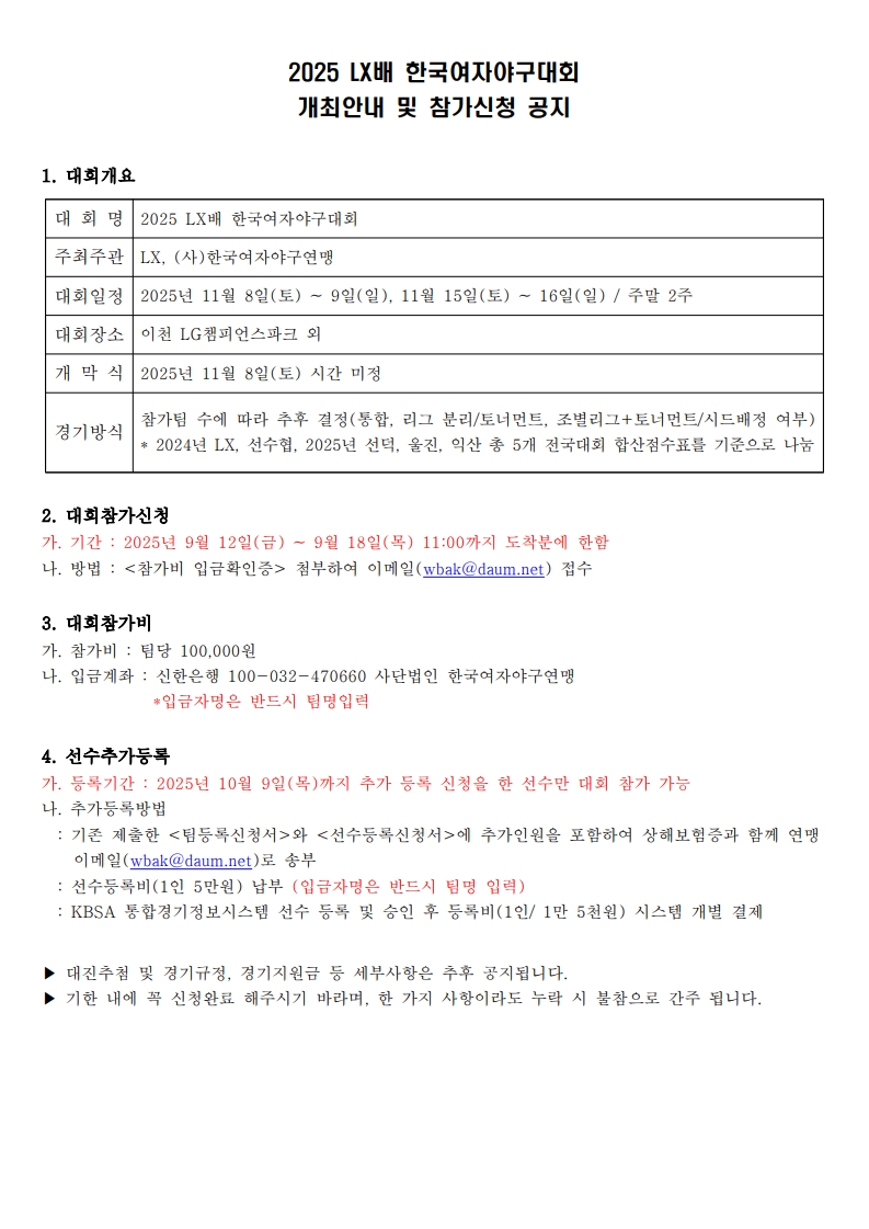 2025 LX배 한국여자야구대회 개최 및 참가안내