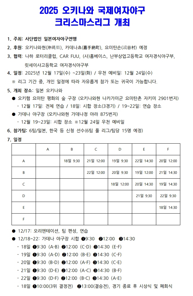 2025 오키나와 국제여자야구 크리스마스리그 개최 안내