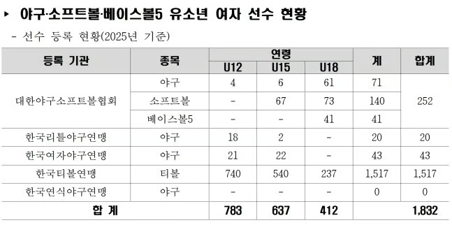 2025년 기준 야구·소프트볼·베이스볼5 유소년 여자 선수 현황. /사진=KBSA 제공
