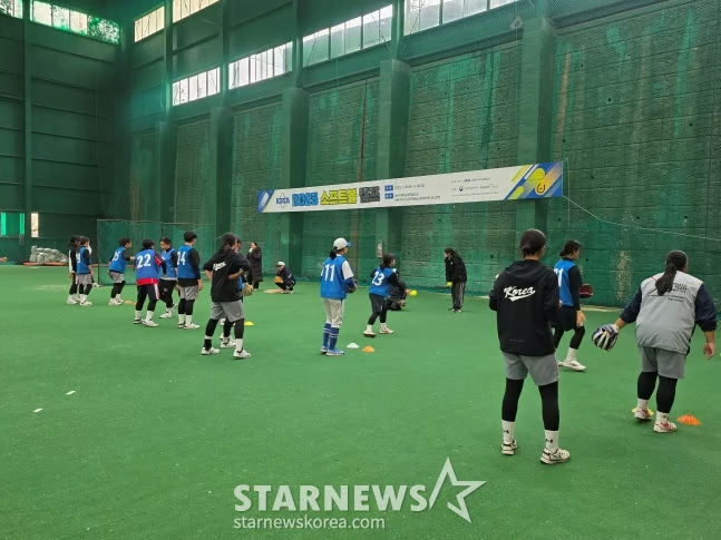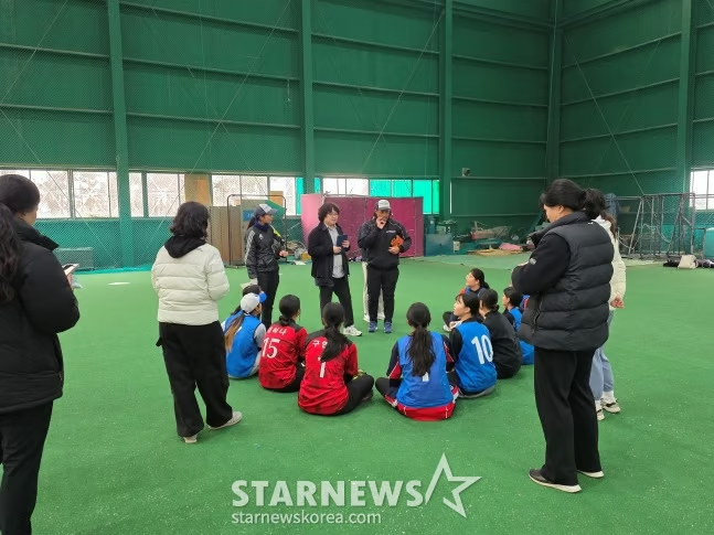 한국 소프트볼 유망주들이 26일 경기도 고양시에 위치한 NH인재원에서 열린 야구·소프트볼·베이스볼5 캠프에서 한국과 일본 소프트볼 지도자들에게 지도받고 있다. /사진=김동윤 기자