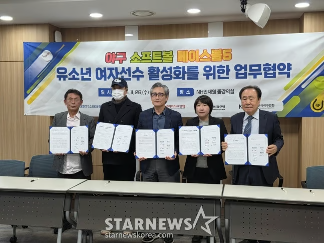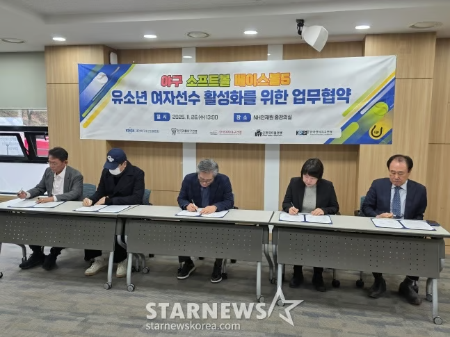 대한야구소프트볼협회·한국리틀야구연맹·한국여자야구연맹·한국티볼연맹·한국연식야구연맹은 26일 오후 경기도 고양시의 NH인재원에서 열린 2025 야구·소프트볼·베이스볼5 캠프 중 유소년 여자 선수 활성화를 위한 업무협약을 체결했다.